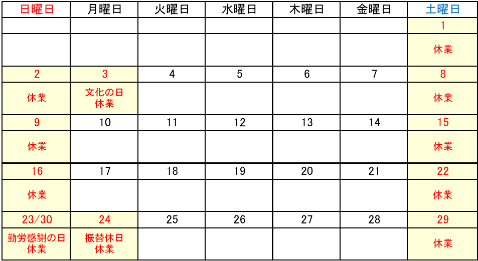 11月(1日、2日、3日、8日、9日、15日、16日、22日、23日、24日、29日、30日)